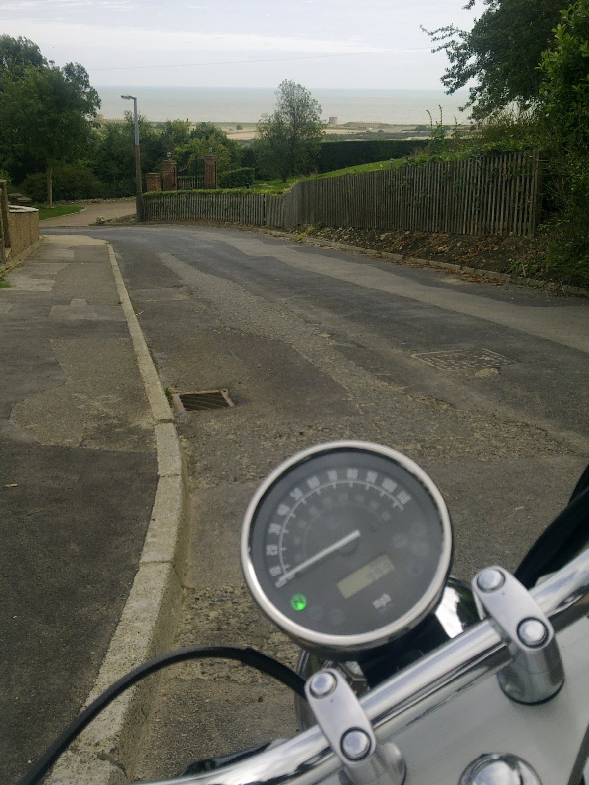 | If you look closely at the speedo the odometer is reading 999. That's Hythe firing ranges and the English Channel in the distance. |